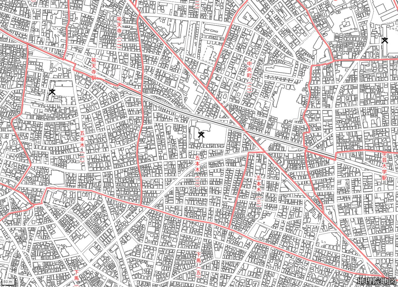 地図の内容は国土地理院が作成した時点の情報を反映しており、実際の現況とは異なる場合があります。現在は存在しない建物や道路、新たに整備された施設などが含まれることがありますので、あらかじめご了承ください。