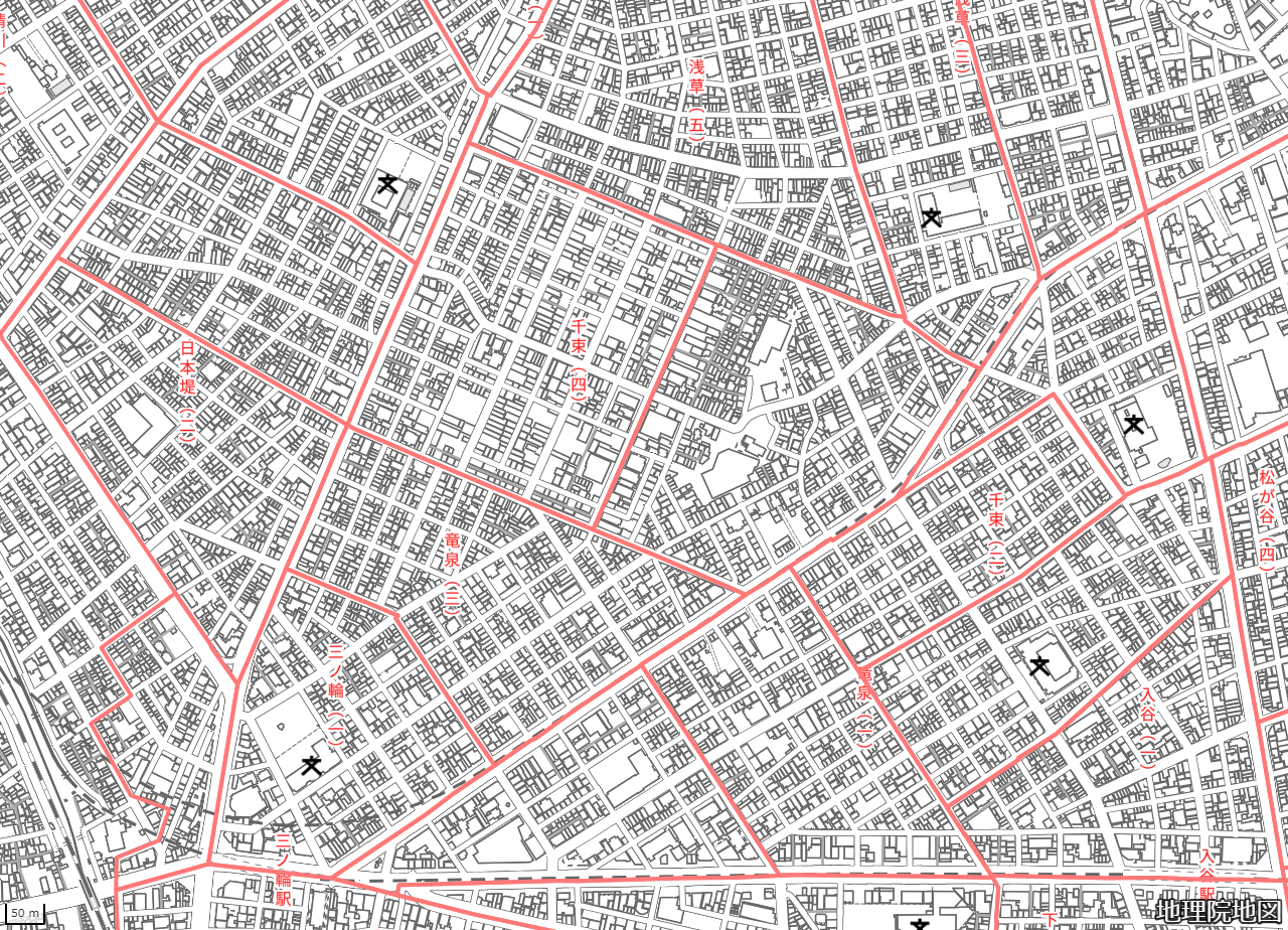 地図の内容は国土地理院が作成した時点の情報を反映しており、実際の現況とは異なる場合があります。現在は存在しない建物や道路、新たに整備された施設などが含まれることがありますので、あらかじめご了承ください。