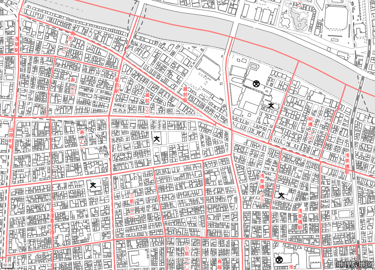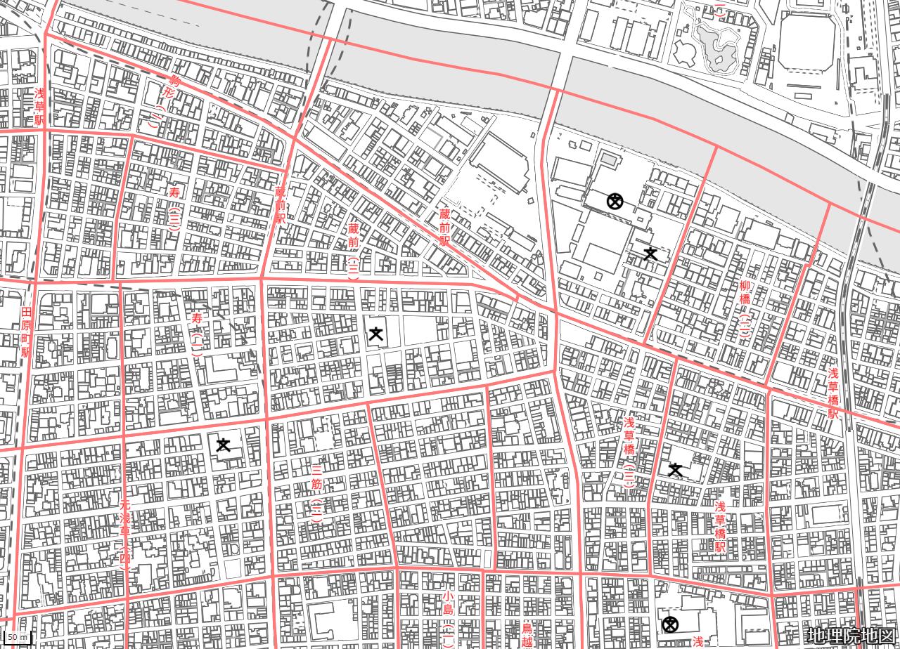 地図の内容は国土地理院が作成した時点の情報を反映しており、実際の現況とは異なる場合があります。現在は存在しない建物や道路、新たに整備された施設などが含まれることがありますので、あらかじめご了承ください。