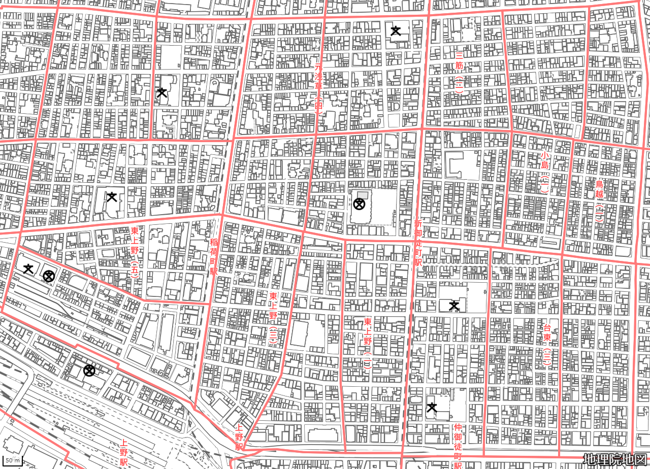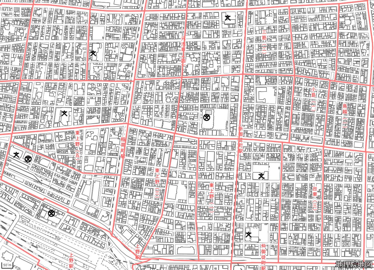 地図の内容は国土地理院が作成した時点の情報を反映しており、実際の現況とは異なる場合があります。現在は存在しない建物や道路、新たに整備された施設などが含まれることがありますので、あらかじめご了承ください。