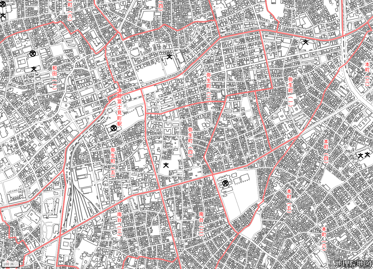 地図の内容は国土地理院が作成した時点の情報を反映しており、実際の現況とは異なる場合があります。現在は存在しない建物や道路、新たに整備された施設などが含まれることがありますので、あらかじめご了承ください。