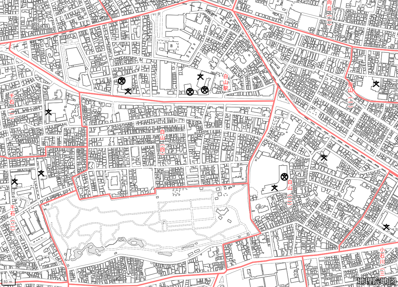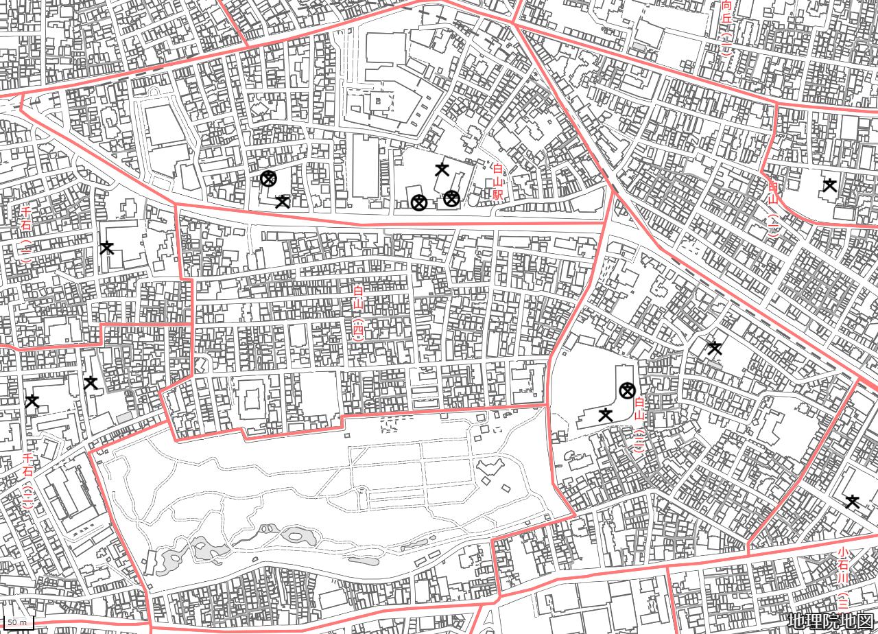 地図の内容は国土地理院が作成した時点の情報を反映しており、実際の現況とは異なる場合があります。現在は存在しない建物や道路、新たに整備された施設などが含まれることがありますので、あらかじめご了承ください。