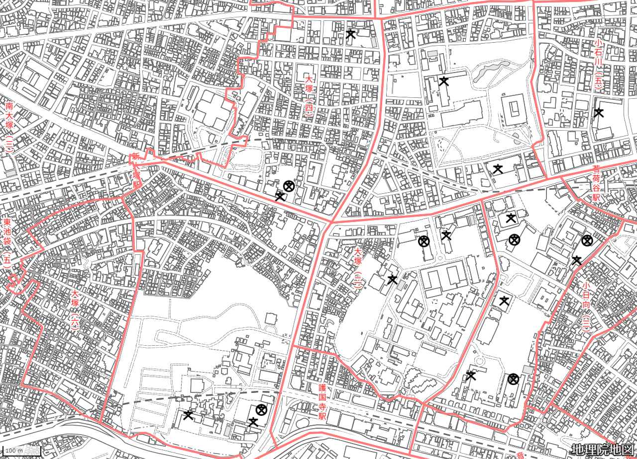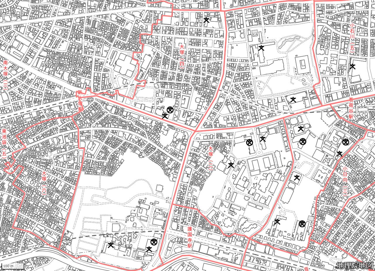 地図の内容は国土地理院が作成した時点の情報を反映しており、実際の現況とは異なる場合があります。現在は存在しない建物や道路、新たに整備された施設などが含まれることがありますので、あらかじめご了承ください。