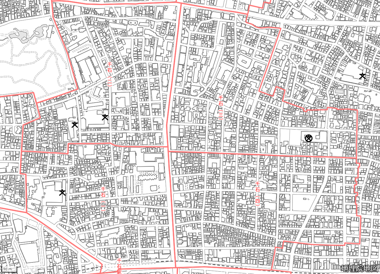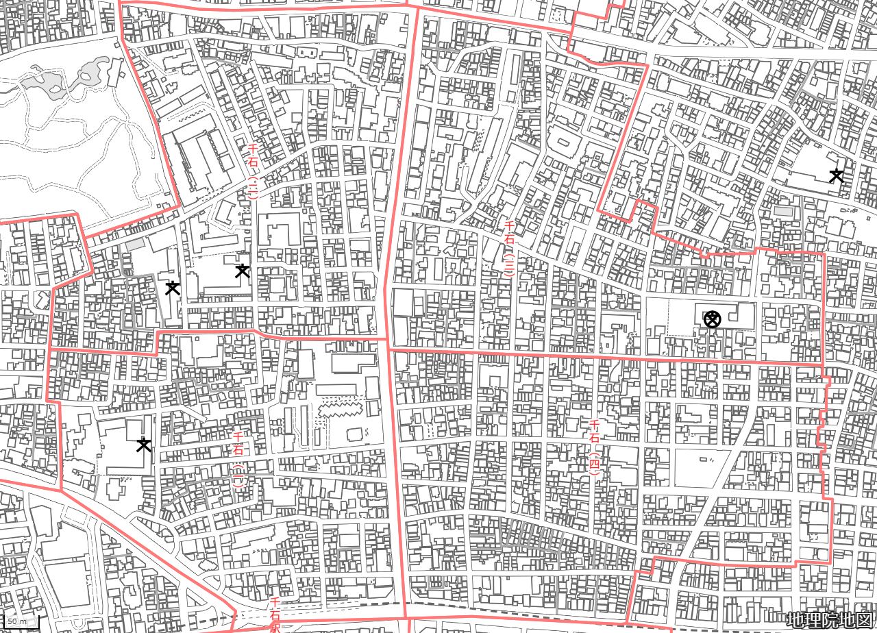 地図の内容は国土地理院が作成した時点の情報を反映しており、実際の現況とは異なる場合があります。現在は存在しない建物や道路、新たに整備された施設などが含まれることがありますので、あらかじめご了承ください。