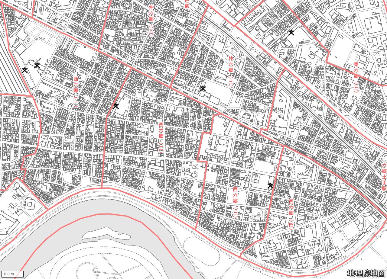 地図の内容は国土地理院が作成した時点の情報を反映しており、実際の現況とは異なる場合があります。現在は存在しない建物や道路、新たに整備された施設などが含まれることがありますので、あらかじめご了承ください。