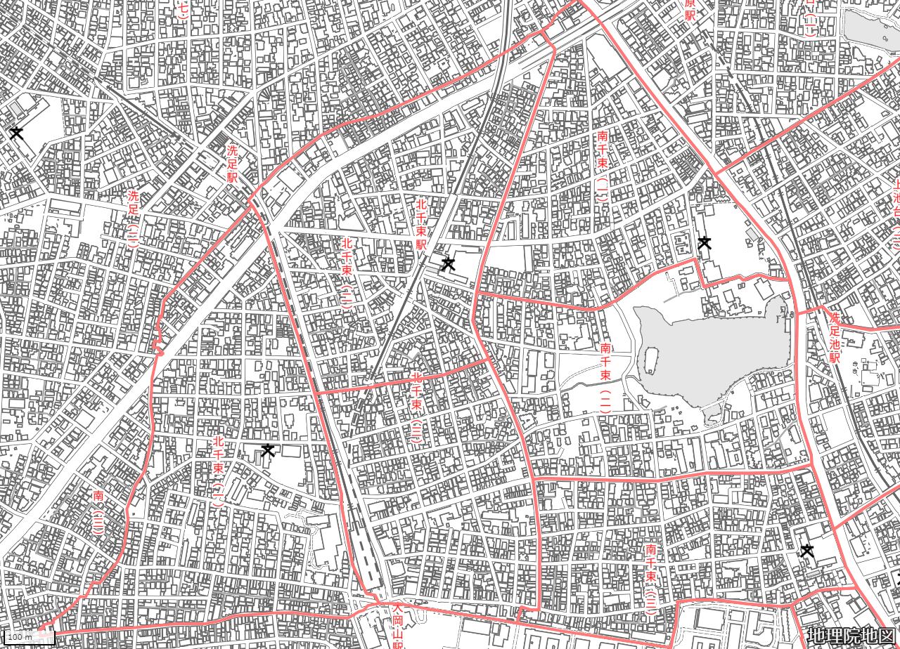 地図の内容は国土地理院が作成した時点の情報を反映しており、実際の現況とは異なる場合があります。現在は存在しない建物や道路、新たに整備された施設などが含まれることがありますので、あらかじめご了承ください。