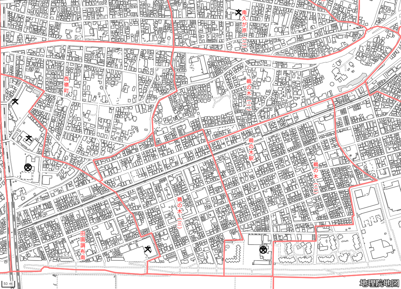 地図の内容は国土地理院が作成した時点の情報を反映しており、実際の現況とは異なる場合があります。現在は存在しない建物や道路、新たに整備された施設などが含まれることがありますので、あらかじめご了承ください。
