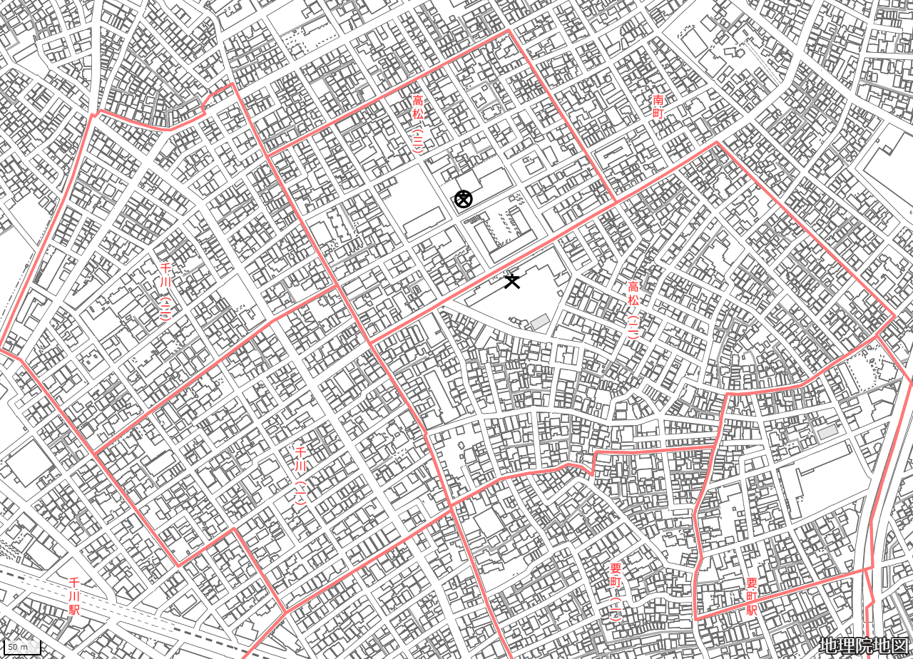 地図の内容は国土地理院が作成した時点の情報を反映しており、実際の現況とは異なる場合があります。現在は存在しない建物や道路、新たに整備された施設などが含まれることがありますので、あらかじめご了承ください。