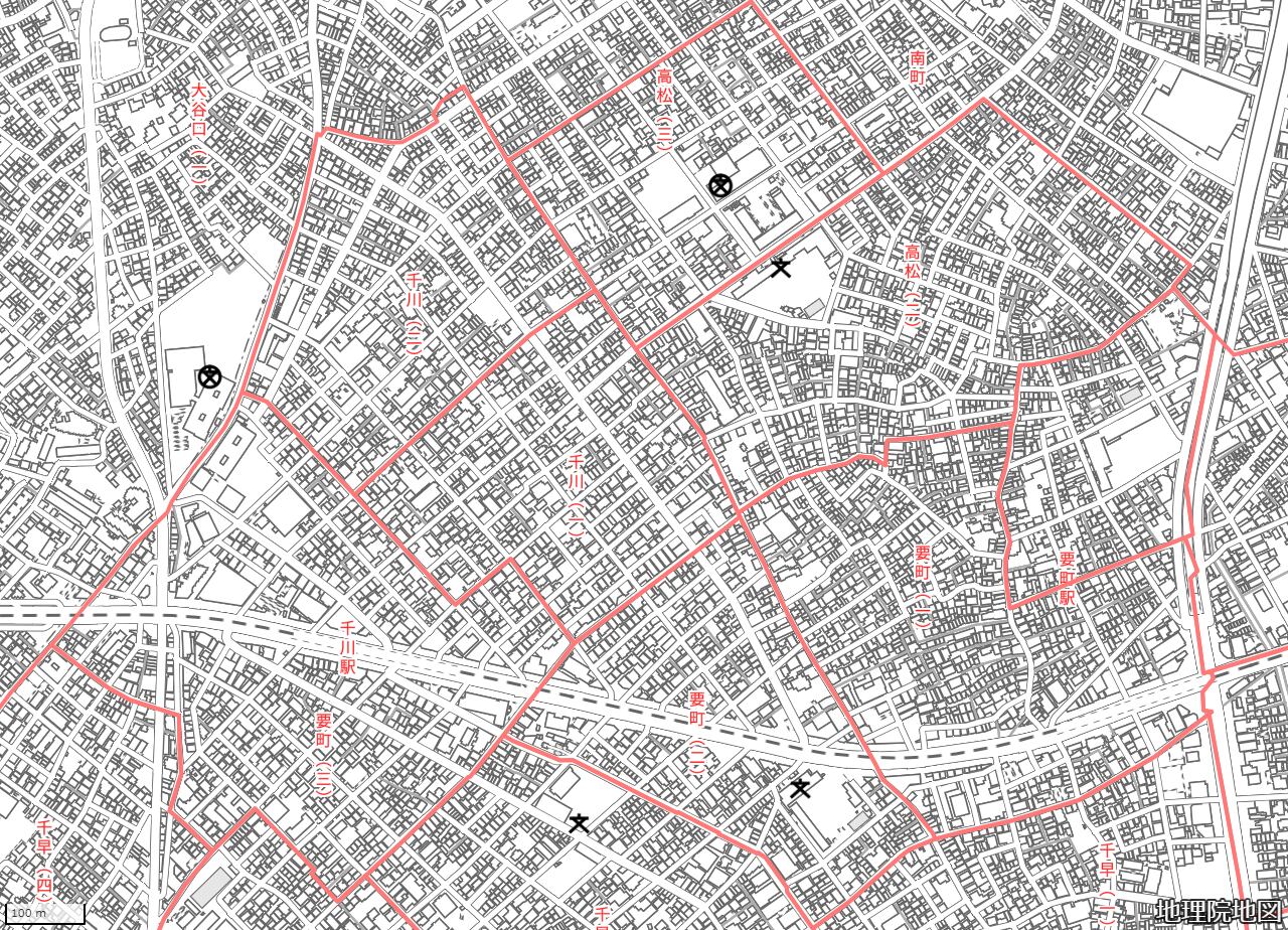 地図の内容は国土地理院が作成した時点の情報を反映しており、実際の現況とは異なる場合があります。現在は存在しない建物や道路、新たに整備された施設などが含まれることがありますので、あらかじめご了承ください。