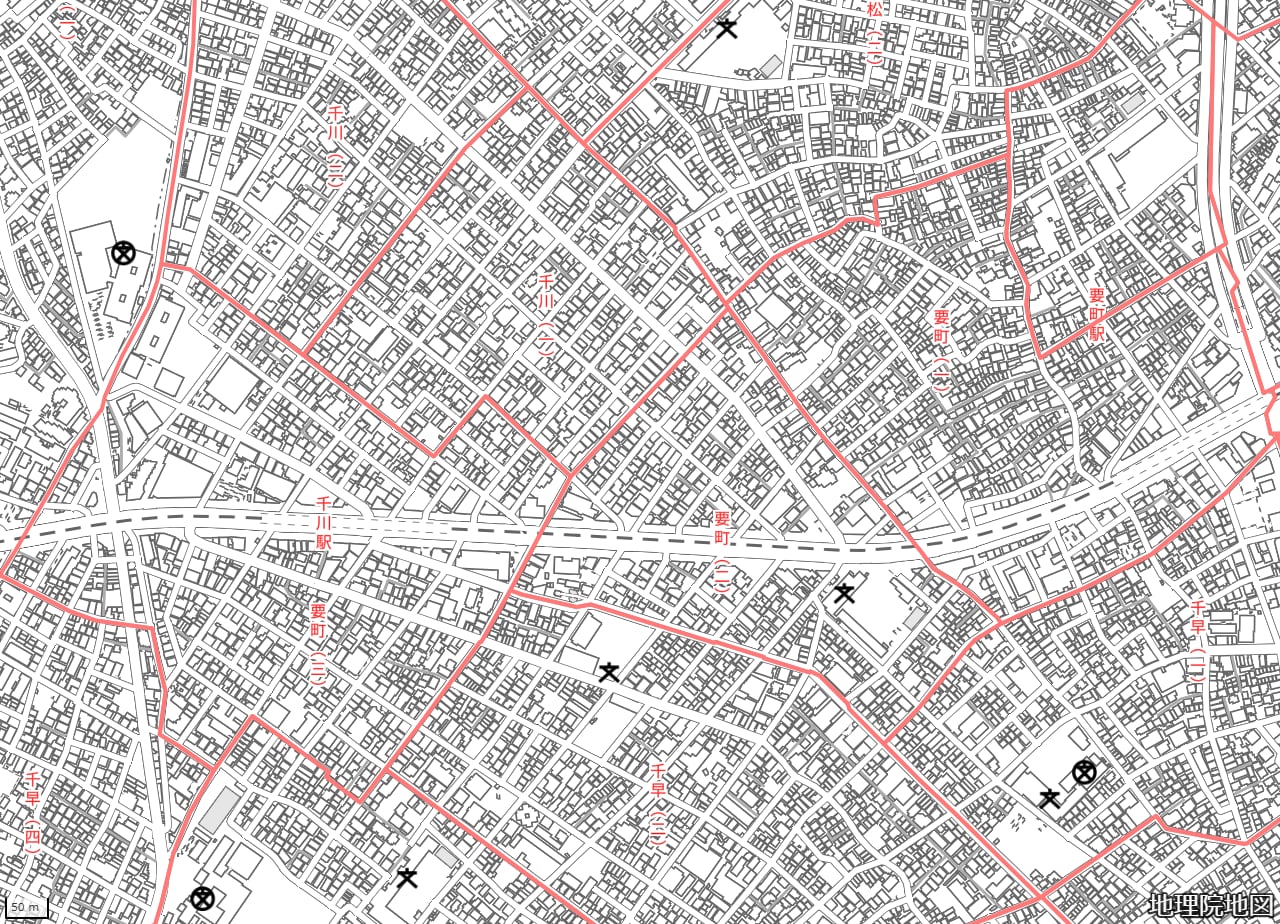 地図の内容は国土地理院が作成した時点の情報を反映しており、実際の現況とは異なる場合があります。現在は存在しない建物や道路、新たに整備された施設などが含まれることがありますので、あらかじめご了承ください。