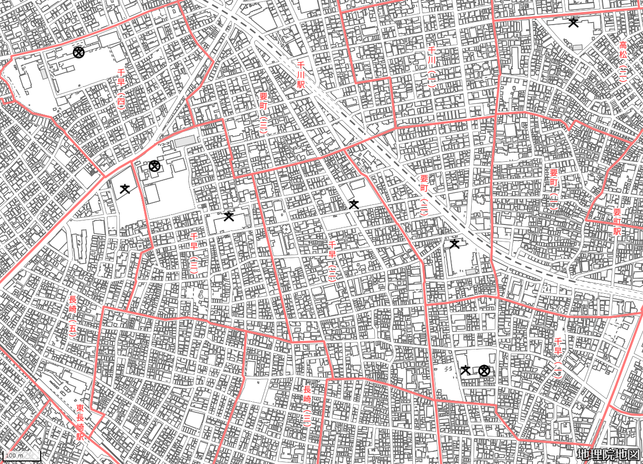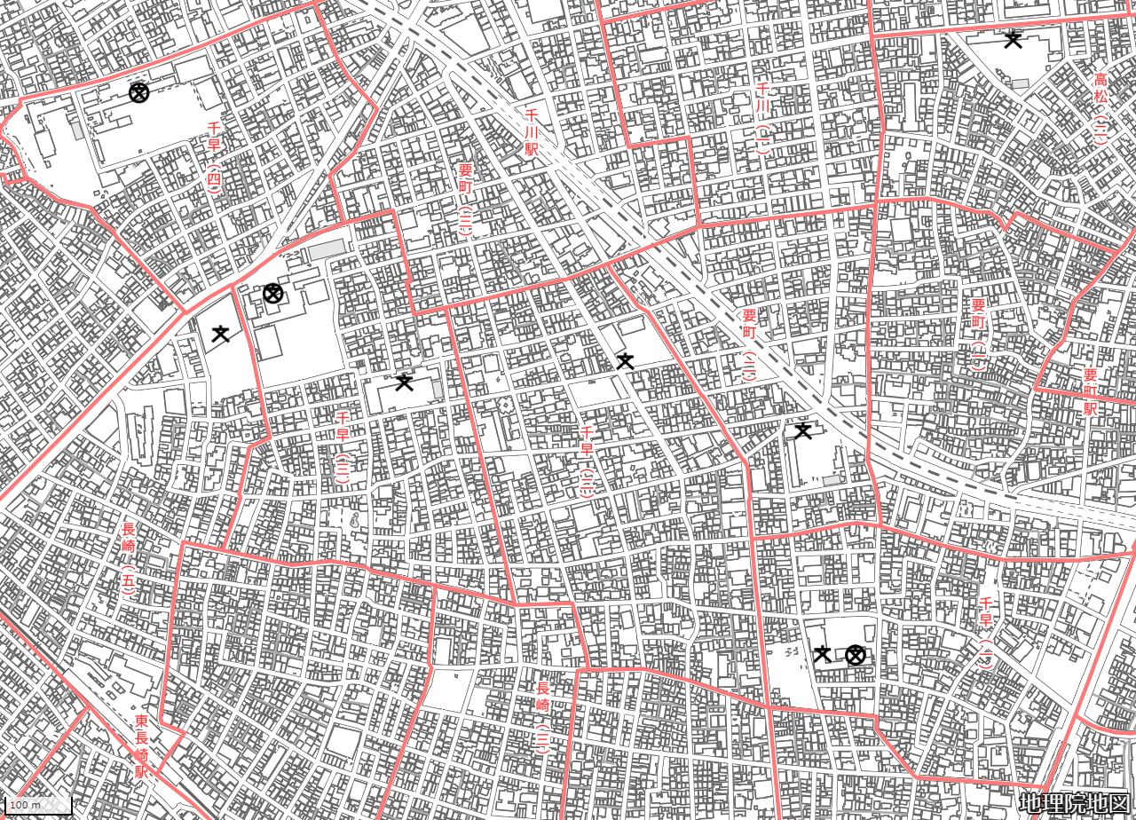 地図の内容は国土地理院が作成した時点の情報を反映しており、実際の現況とは異なる場合があります。現在は存在しない建物や道路、新たに整備された施設などが含まれることがありますので、あらかじめご了承ください。