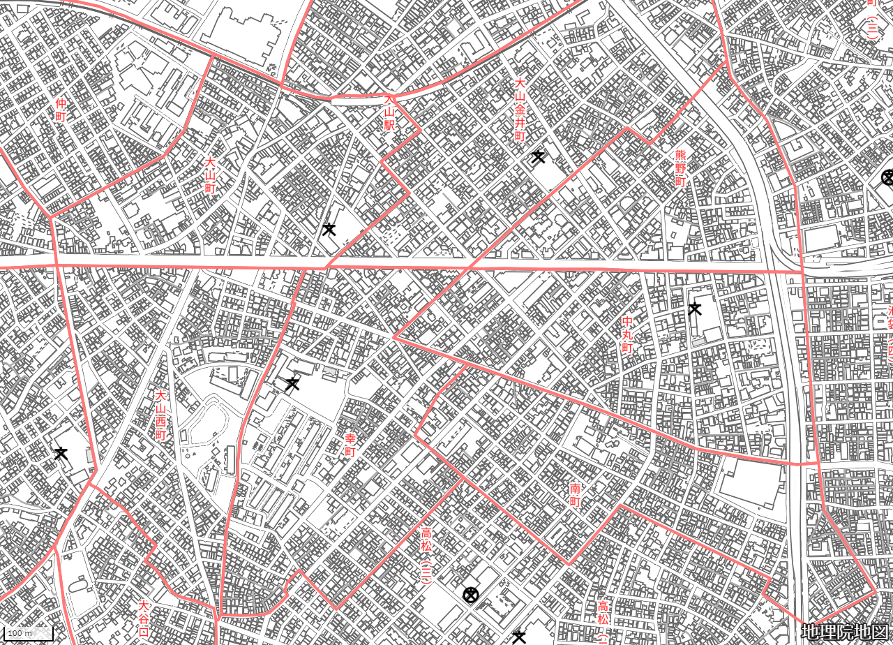 地図の内容は国土地理院が作成した時点の情報を反映しており、実際の現況とは異なる場合があります。現在は存在しない建物や道路、新たに整備された施設などが含まれることがありますので、あらかじめご了承ください。