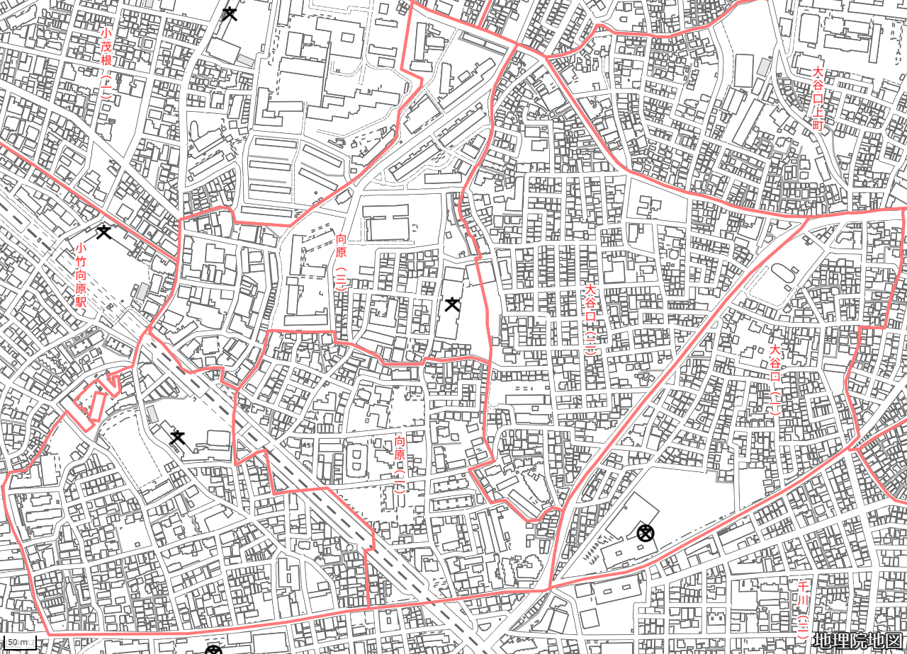 地図の内容は国土地理院が作成した時点の情報を反映しており、実際の現況とは異なる場合があります。現在は存在しない建物や道路、新たに整備された施設などが含まれることがありますので、あらかじめご了承ください。