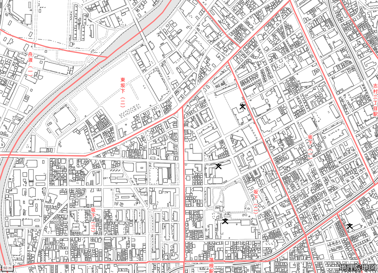 地図の内容は国土地理院が作成した時点の情報を反映しており、実際の現況とは異なる場合があります。現在は存在しない建物や道路、新たに整備された施設などが含まれることがありますので、あらかじめご了承ください。