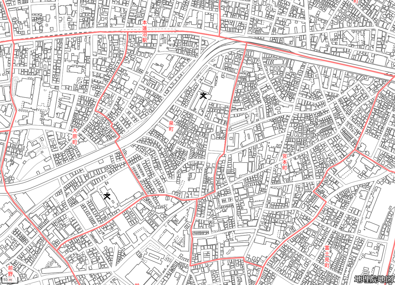 地図の内容は国土地理院が作成した時点の情報を反映しており、実際の現況とは異なる場合があります。現在は存在しない建物や道路、新たに整備された施設などが含まれることがありますので、あらかじめご了承ください。