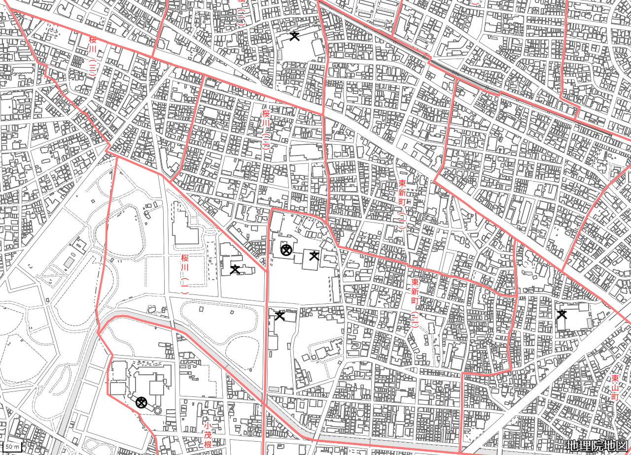 地図の内容は国土地理院が作成した時点の情報を反映しており、実際の現況とは異なる場合があります。現在は存在しない建物や道路、新たに整備された施設などが含まれることがありますので、あらかじめご了承ください。