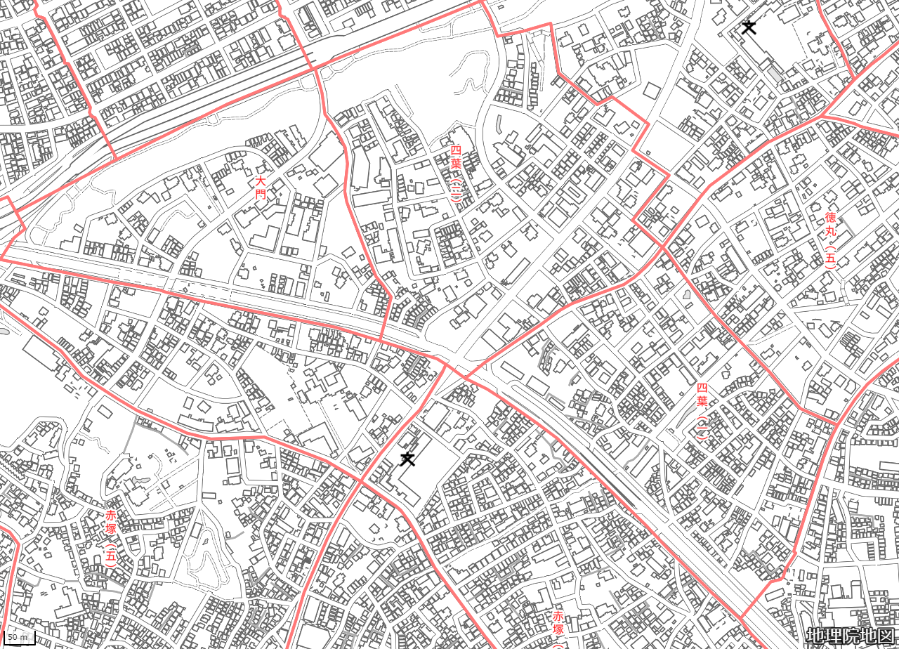 地図の内容は国土地理院が作成した時点の情報を反映しており、実際の現況とは異なる場合があります。現在は存在しない建物や道路、新たに整備された施設などが含まれることがありますので、あらかじめご了承ください。