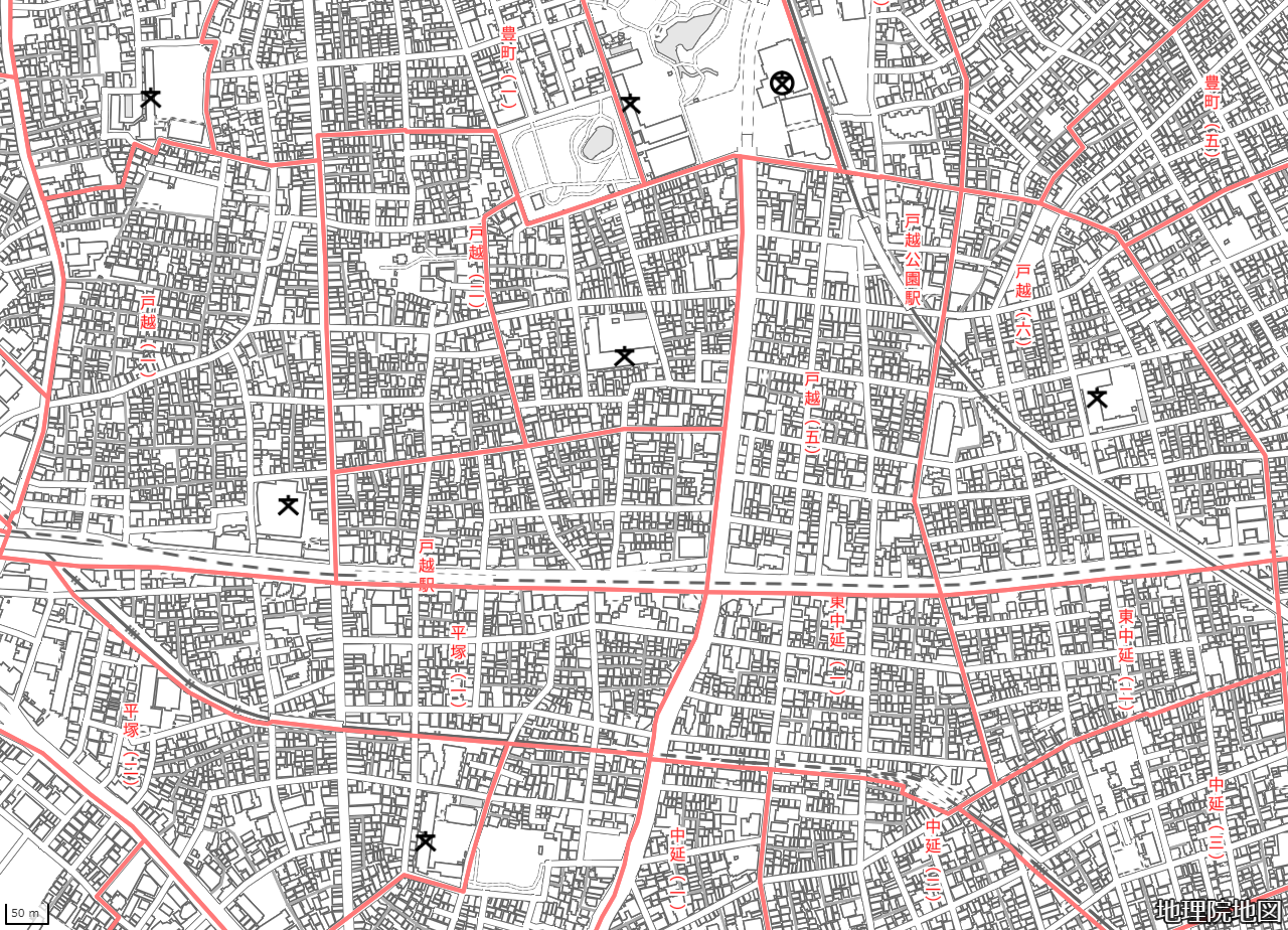地図の内容は国土地理院が作成した時点の情報を反映しており、実際の現況とは異なる場合があります。現在は存在しない建物や道路、新たに整備された施設などが含まれることがありますので、あらかじめご了承ください。