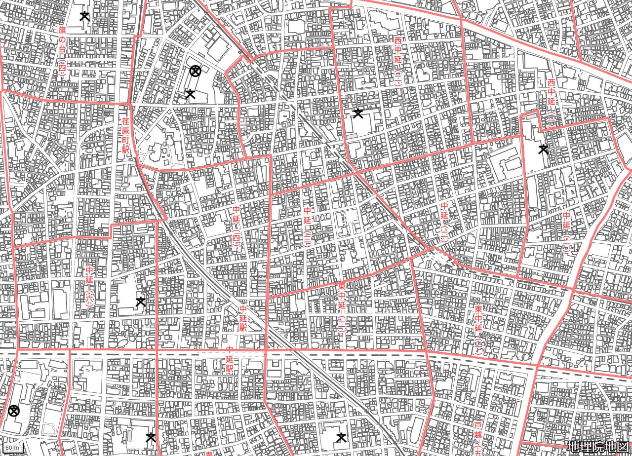 地図の内容は国土地理院が作成した時点の情報を反映しており、実際の現況とは異なる場合があります。現在は存在しない建物や道路、新たに整備された施設などが含まれることがありますので、あらかじめご了承ください。