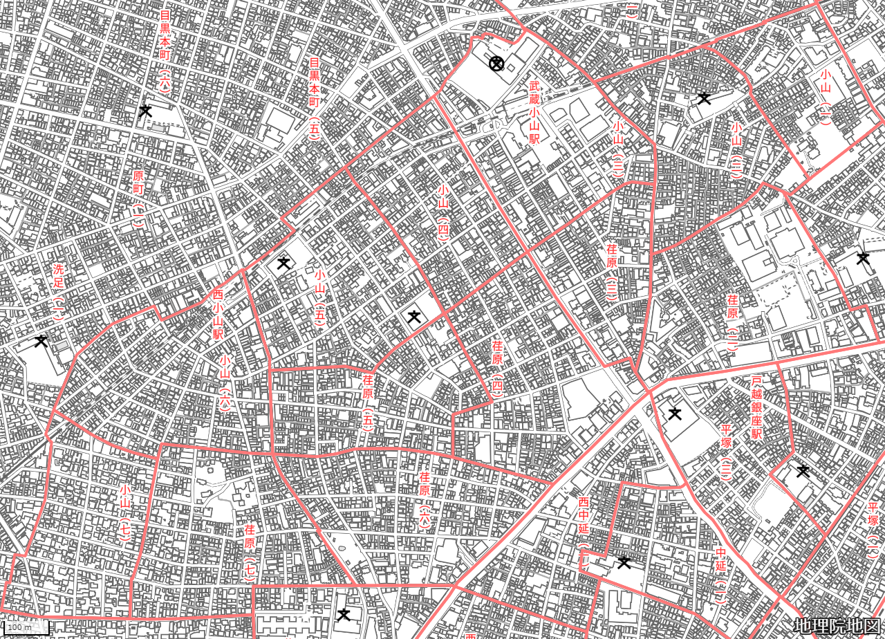 地図の内容は国土地理院が作成した時点の情報を反映しており、実際の現況とは異なる場合があります。現在は存在しない建物や道路、新たに整備された施設などが含まれることがありますので、あらかじめご了承ください。