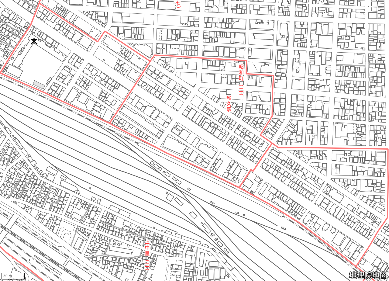 地図の内容は国土地理院が作成した時点の情報を反映しており、実際の現況とは異なる場合があります。現在は存在しない建物や道路、新たに整備された施設などが含まれることがありますので、あらかじめご了承ください。