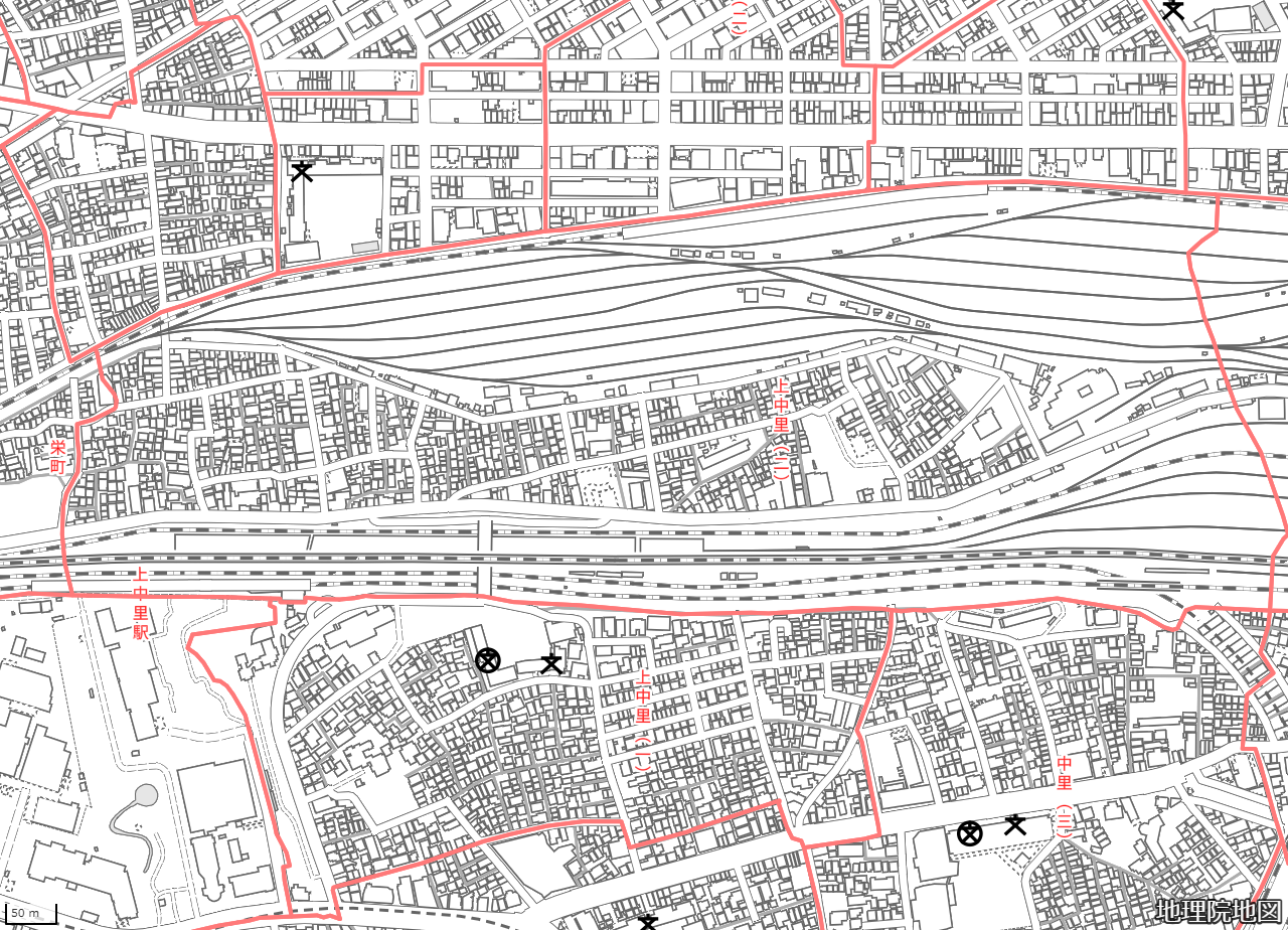地図の内容は国土地理院が作成した時点の情報を反映しており、実際の現況とは異なる場合があります。現在は存在しない建物や道路、新たに整備された施設などが含まれることがありますので、あらかじめご了承ください。