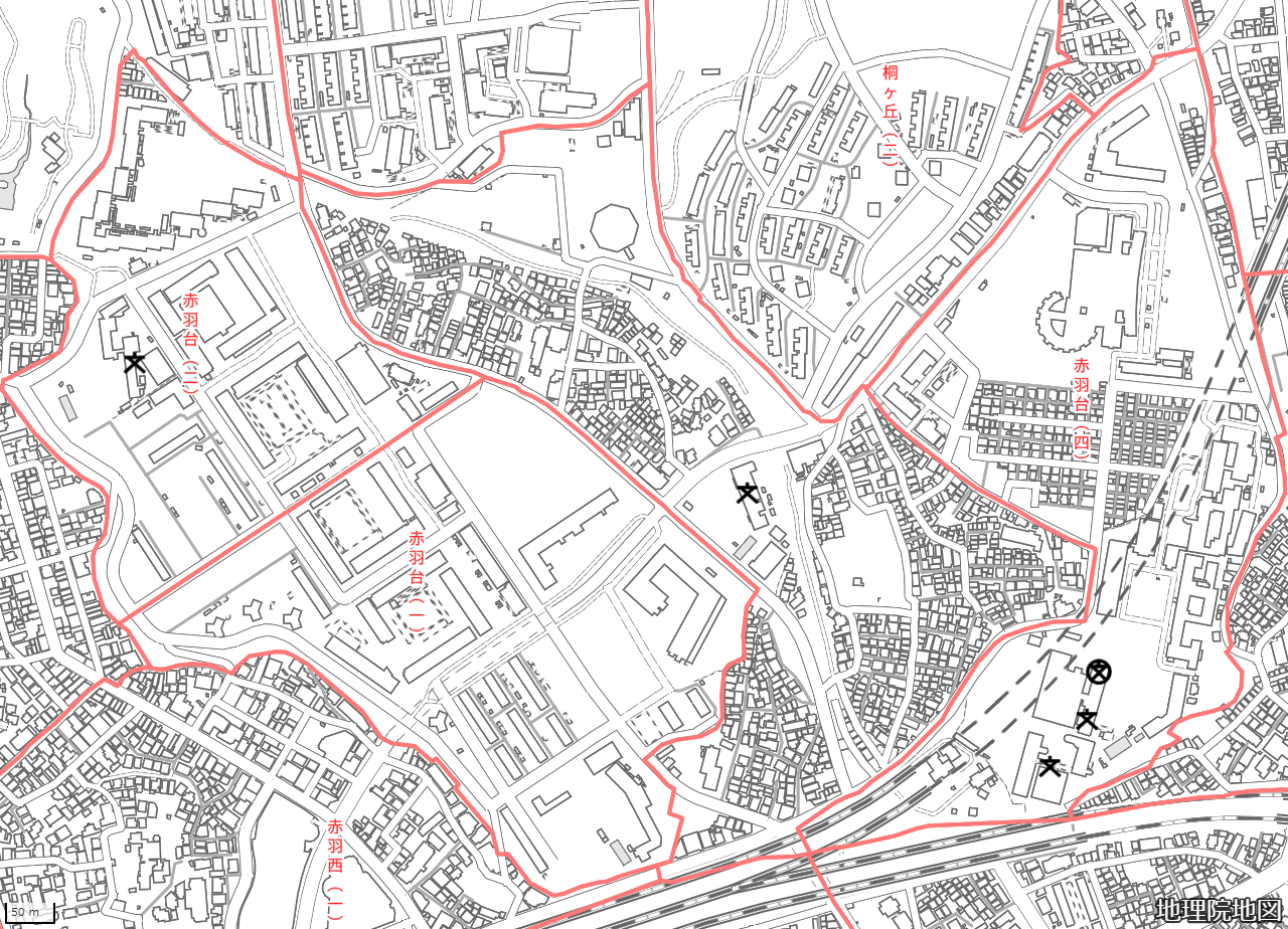地図の内容は国土地理院が作成した時点の情報を反映しており、実際の現況とは異なる場合があります。現在は存在しない建物や道路、新たに整備された施設などが含まれることがありますので、あらかじめご了承ください。