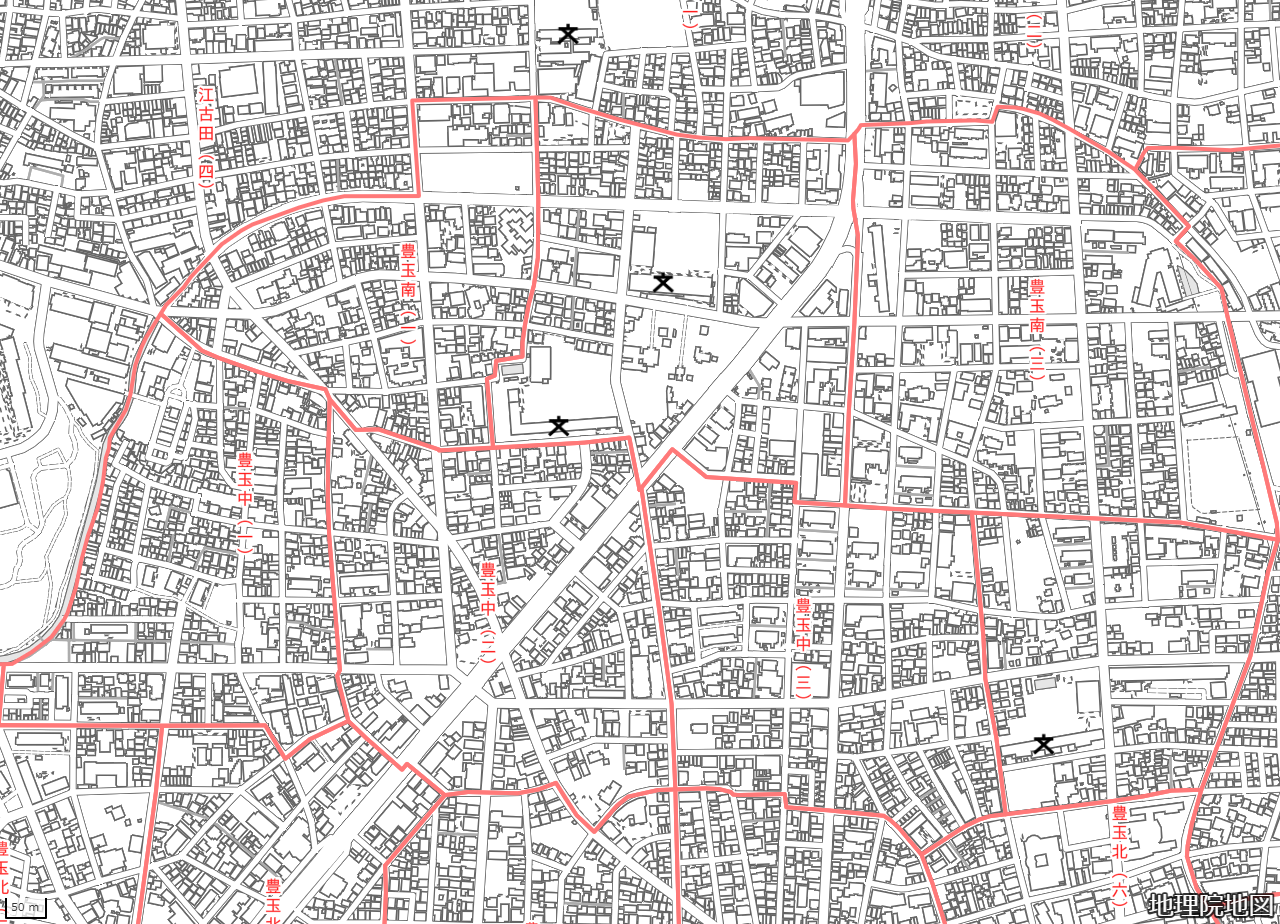 地図の内容は国土地理院が作成した時点の情報を反映しており、実際の現況とは異なる場合があります。現在は存在しない建物や道路、新たに整備された施設などが含まれることがありますので、あらかじめご了承ください。