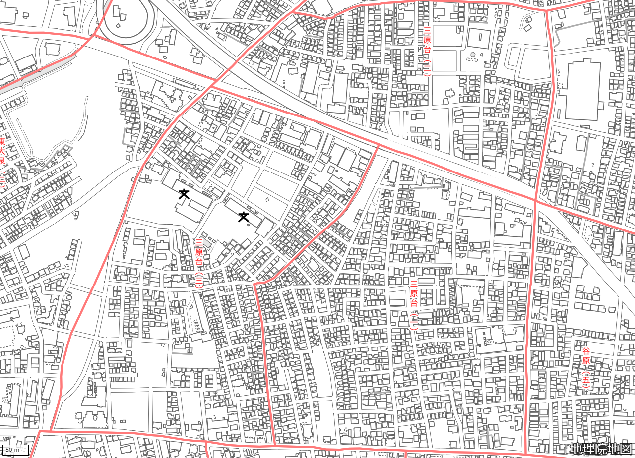 地図の内容は国土地理院が作成した時点の情報を反映しており、実際の現況とは異なる場合があります。現在は存在しない建物や道路、新たに整備された施設などが含まれることがありますので、あらかじめご了承ください。