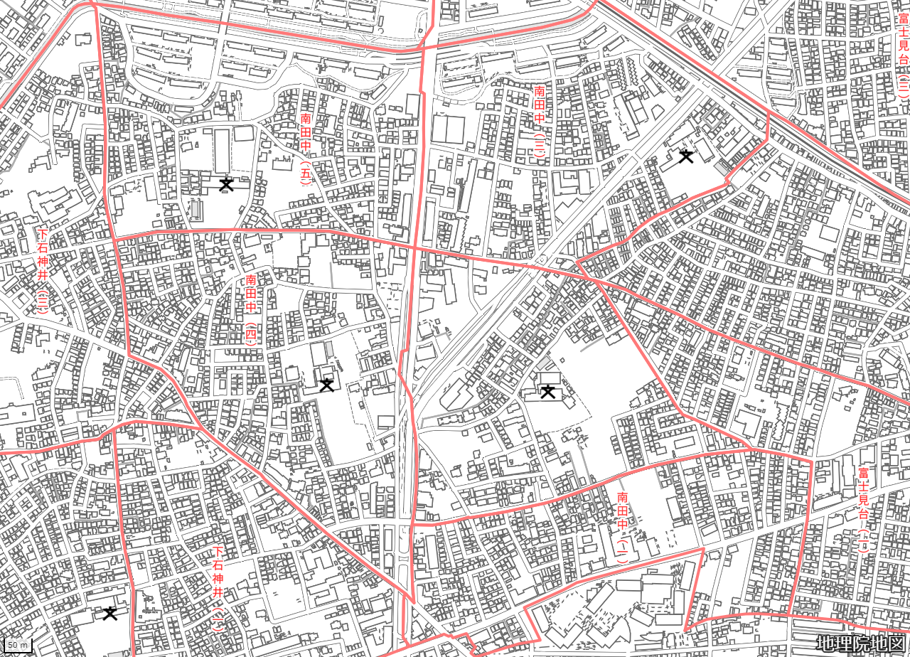 地図の内容は国土地理院が作成した時点の情報を反映しており、実際の現況とは異なる場合があります。現在は存在しない建物や道路、新たに整備された施設などが含まれることがありますので、あらかじめご了承ください。
