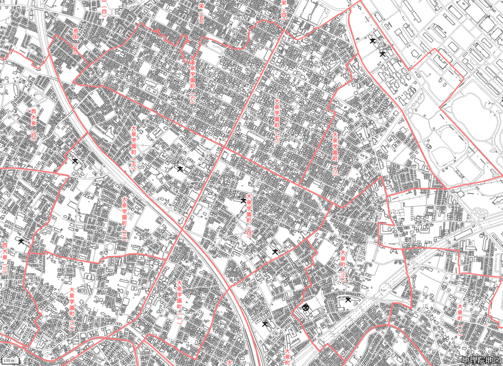 地図の内容は国土地理院が作成した時点の情報を反映しており、実際の現況とは異なる場合があります。現在は存在しない建物や道路、新たに整備された施設などが含まれることがありますので、あらかじめご了承ください。