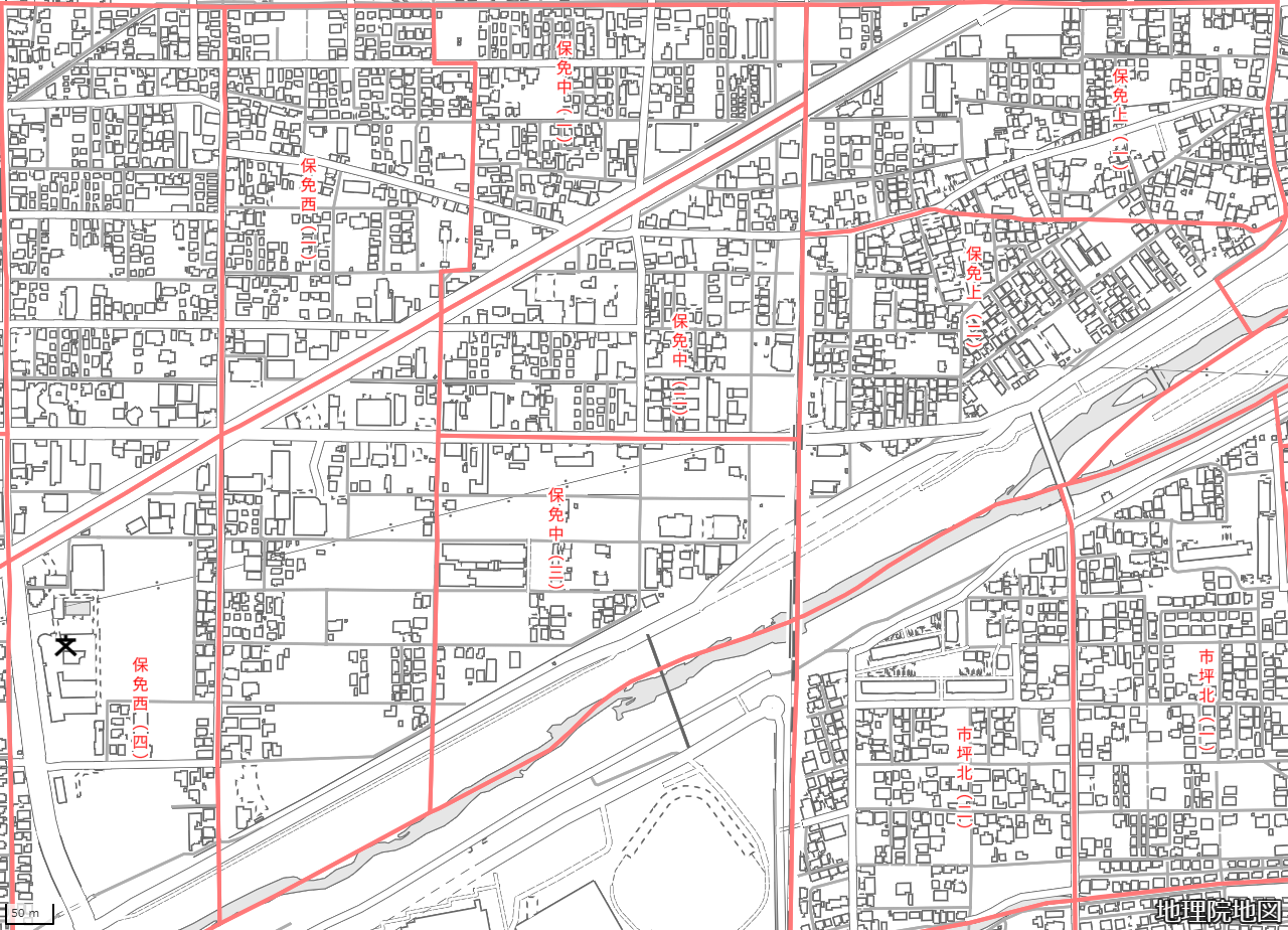 地図の内容は国土地理院が作成した時点の情報を反映しており、実際の現況とは異なる場合があります。現在は存在しない建物や道路、新たに整備された施設などが含まれることがありますので、あらかじめご了承ください。