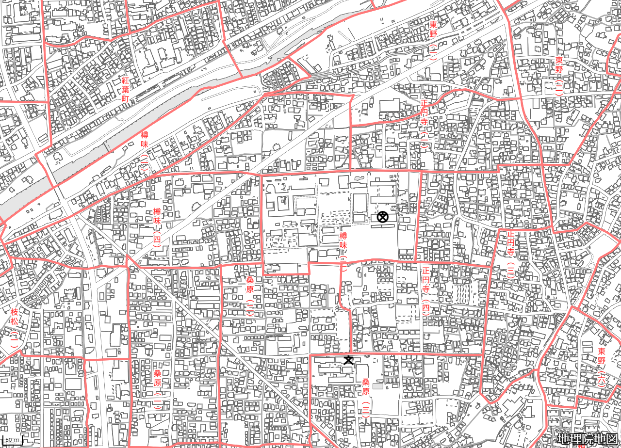 地図の内容は国土地理院が作成した時点の情報を反映しており、実際の現況とは異なる場合があります。現在は存在しない建物や道路、新たに整備された施設などが含まれることがありますので、あらかじめご了承ください。