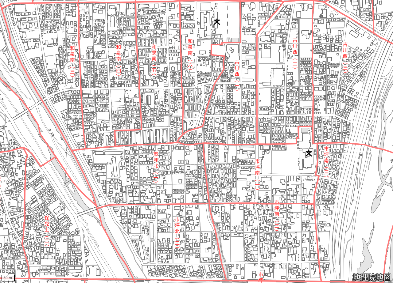 地図の内容は国土地理院が作成した時点の情報を反映しており、実際の現況とは異なる場合があります。現在は存在しない建物や道路、新たに整備された施設などが含まれることがありますので、あらかじめご了承ください。