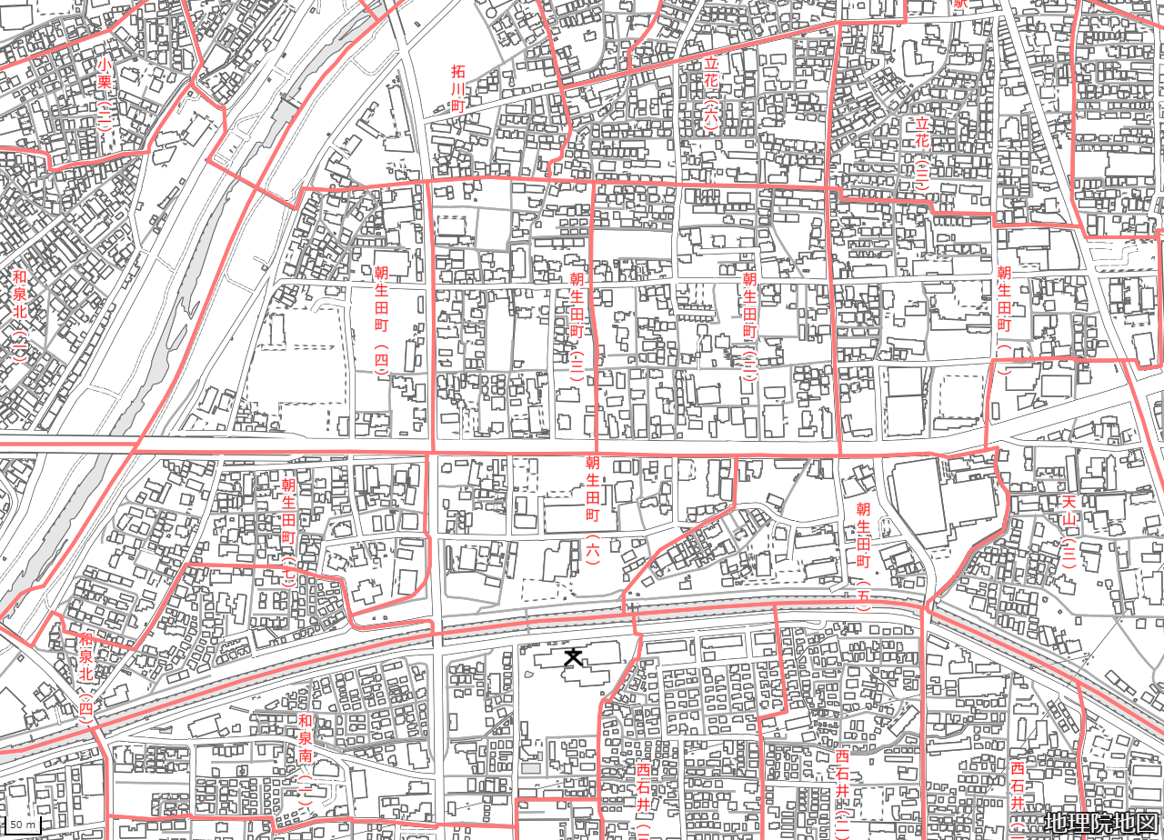 地図の内容は国土地理院が作成した時点の情報を反映しており、実際の現況とは異なる場合があります。現在は存在しない建物や道路、新たに整備された施設などが含まれることがありますので、あらかじめご了承ください。