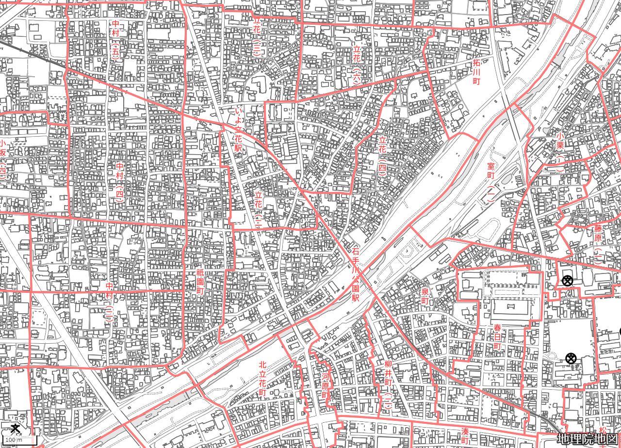 地図の内容は国土地理院が作成した時点の情報を反映しており、実際の現況とは異なる場合があります。現在は存在しない建物や道路、新たに整備された施設などが含まれることがありますので、あらかじめご了承ください。