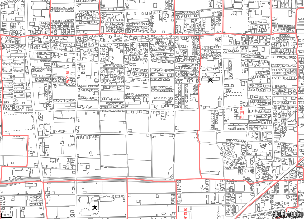 地図の内容は国土地理院が作成した時点の情報を反映しており、実際の現況とは異なる場合があります。現在は存在しない建物や道路、新たに整備された施設などが含まれることがありますので、あらかじめご了承ください。