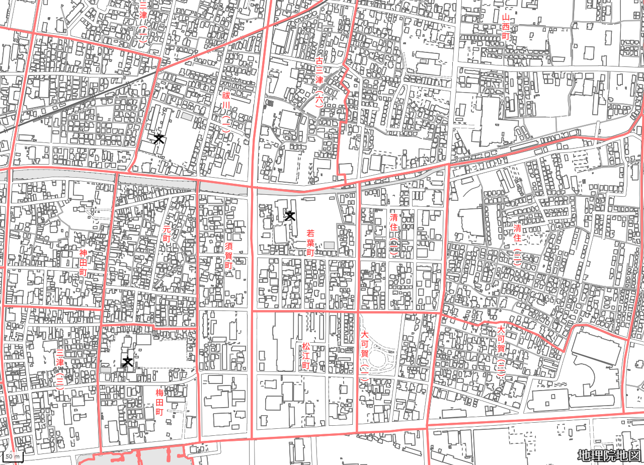 地図の内容は国土地理院が作成した時点の情報を反映しており、実際の現況とは異なる場合があります。現在は存在しない建物や道路、新たに整備された施設などが含まれることがありますので、あらかじめご了承ください。